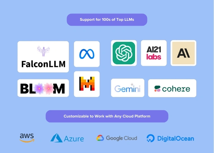 Choose between OpenAI, Anthropic Claude, Google Gemini. Or, use one of the top open LLMs hosted on your cloud. Avoid leaking sensitive data.